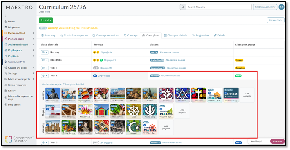 - On the sidebar menu, go to Design and lead then Live curriculum and click on the Class plans tab at the top of the page.
