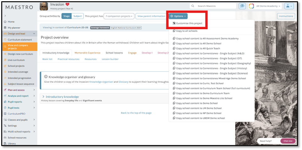 To add additional skills to a project from a different year group, enter the project and click on the ‘Options’ button. Then select ‘Customise this project’.