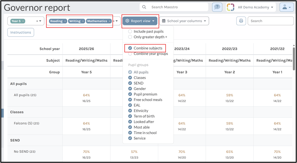 You can also view the combined RWM percentages for your selected children. In the subject filter, select Reading, Writing and Maths then click on Report view. Select Combine subjects and this will show you the percentage of children who are working at the expected standard or higher in all three subjects: