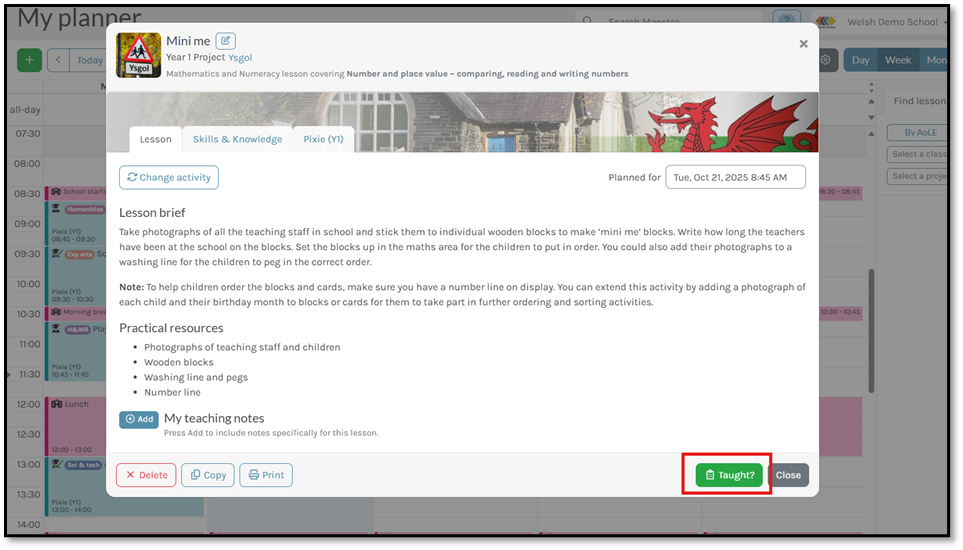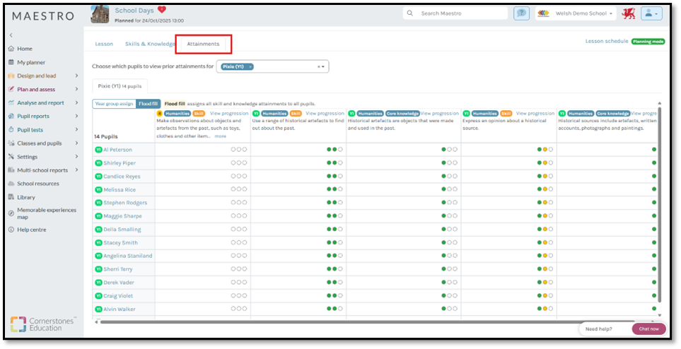Pupils' attainment of a lesson’s knowledge and skills objectives can be recorded in a variety of ways. It can be done through My planner, in the projects, from your Maestro homepage and in the ‘My lessons’ area.