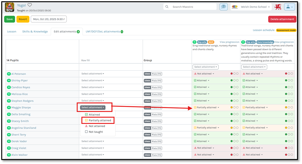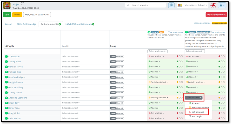 Knowledge and skills objectives can also be recorded on the Class attainment page, should you want to record objectives that have not been taught through a planned lesson.