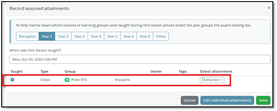 All children will be marked as 'Attained' for the objectives that were taught as part of the lesson, if that was selected on the previous page..