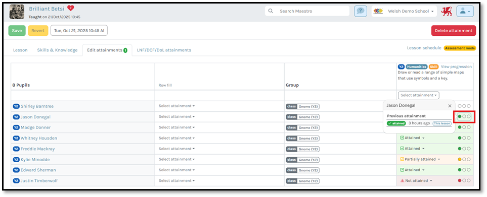 2. You will be able to see their previous attainments for the planned objectives. The three dots show the three most recent attainments for that objective (with the most recent on the left):