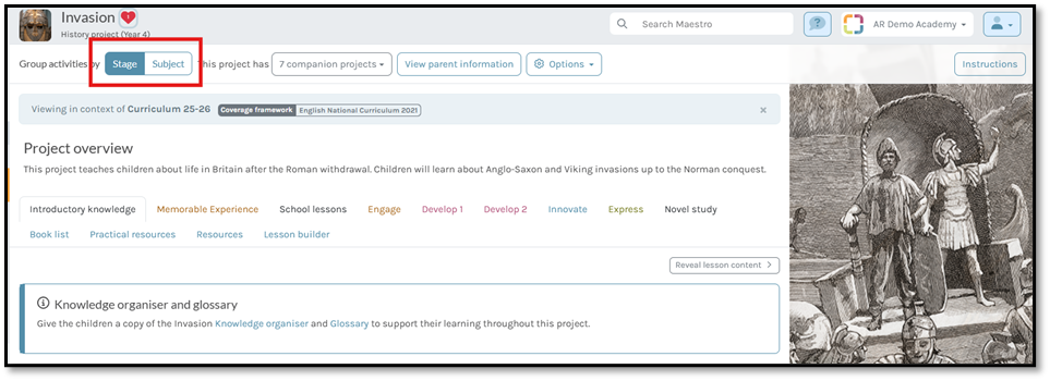 Within each project, you can view the content by the pedagogical Stage - the order in which it should be taught to ensure correct lesson sequence and therefore optimise learning - or by Subject, by using the grey button at the top of the screen to toggle between the two views. To read more about the Cornerstones pedagogy and to understand how the four Cornerstones of learning work, see: The Cornerstones Pedagogy.