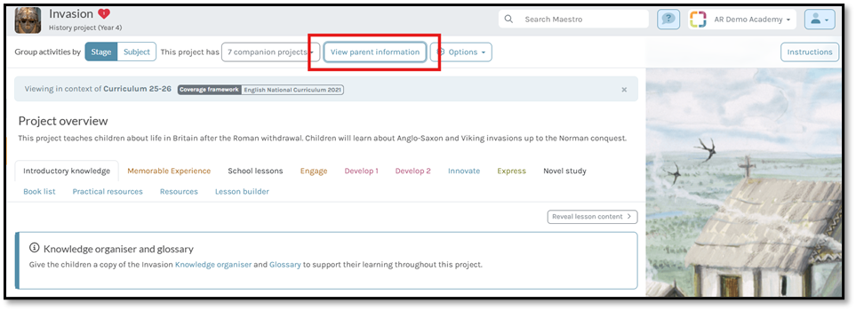 To view the parent information, click the 'View parent information' button. This will open a modal with information about the project that you can copy and paste into a Word document or similar to share with parents. For more information, see: What can I publish online?