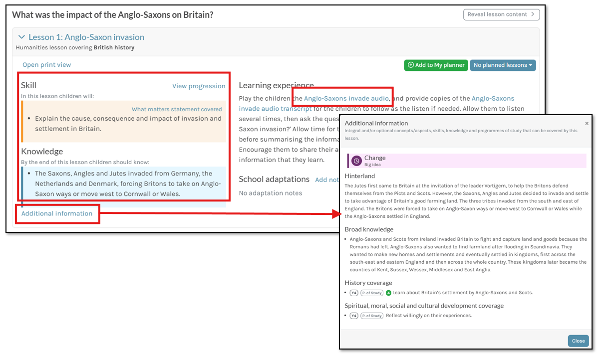 - Click on the 'Additional information' link to also view the Big Ideas, any linked Hinterland and Broad knowledge objectives, the programme of study from the national curriculum, and the number of times each programme of study is taught in your curriculum (green lozenge next to the programme of study).