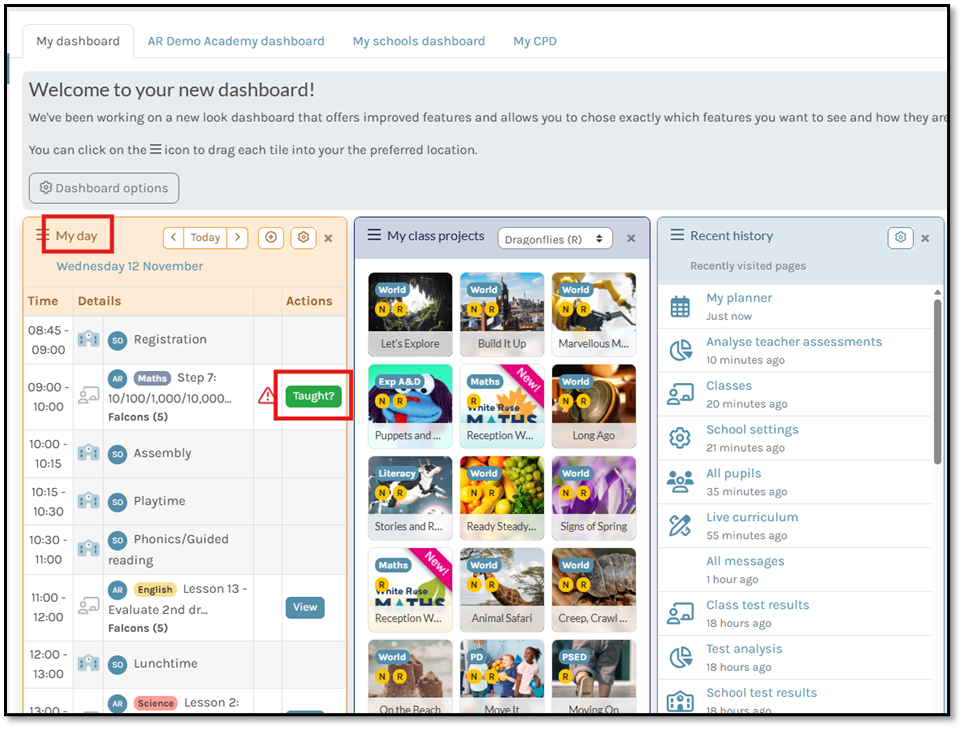 To record your end of lesson attainments for your pupils from the homepage, you have two options: