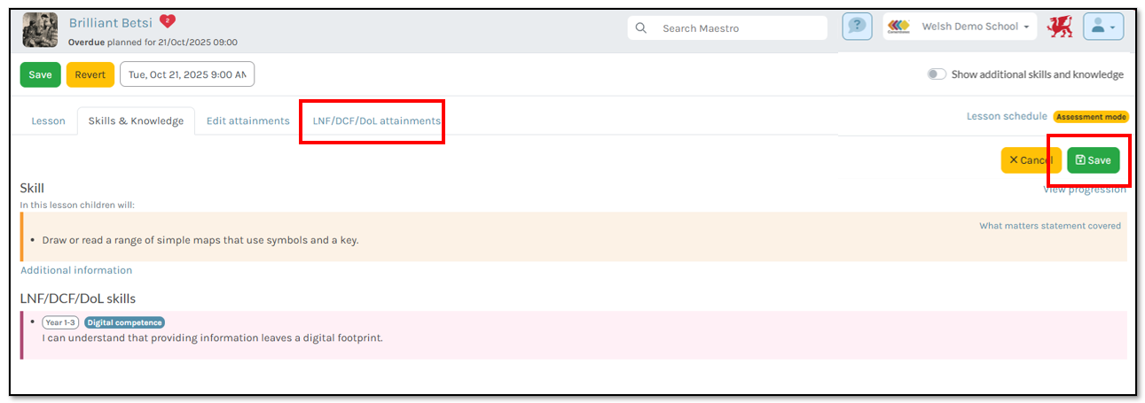 Once you have added all the LNF/DCF/DoL objectives, just click on 'Save' in the top right corner then you can click on the new 'LNF/DCF/DoL attainments' tab.
