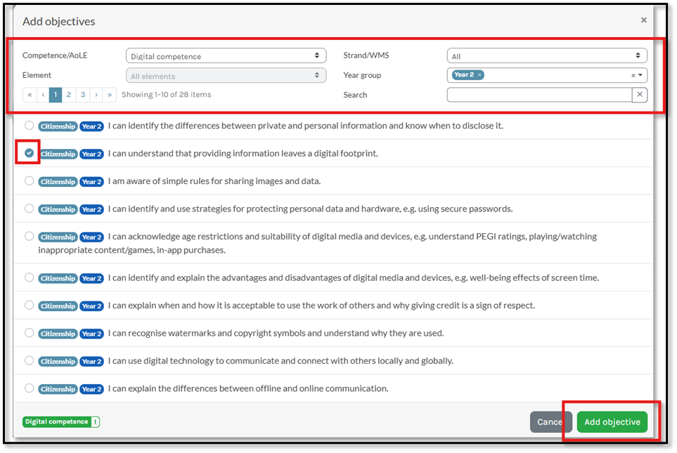 Use the filters sat the top of the page to find the required objectives, select them and then click 'Add objective'.