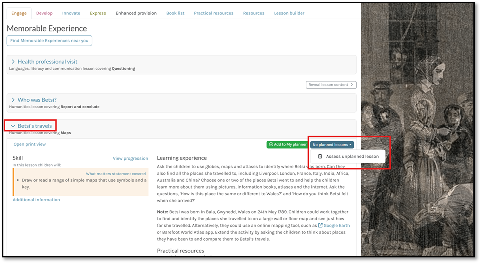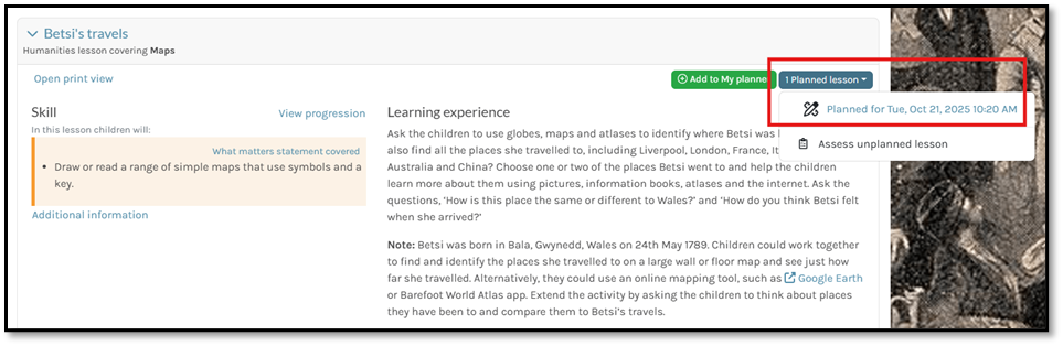 When you return to the project, you will now see that a lesson has been taught, and you can click on the 'Planned lesson' button and select the lesson to show you the details. You can also review all lessons you have recorded attainments for by where it now says when the lesson was taught.