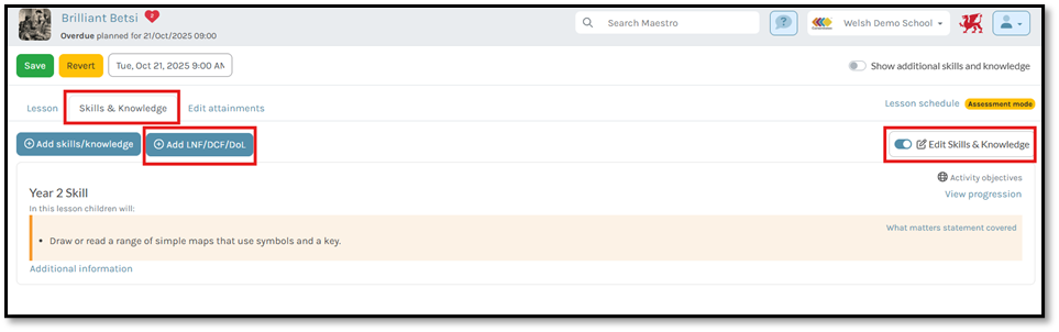 Please note - if you wish to include LNF/DCF objectives for the lesson, you will need to repeat this process to get to page where you record individual attainments then click the 'Skills and knowledge' tab at the top of the page, select to 'Edit Skills and knowledge' and then click '+Add LNF/DCF/DoL'.