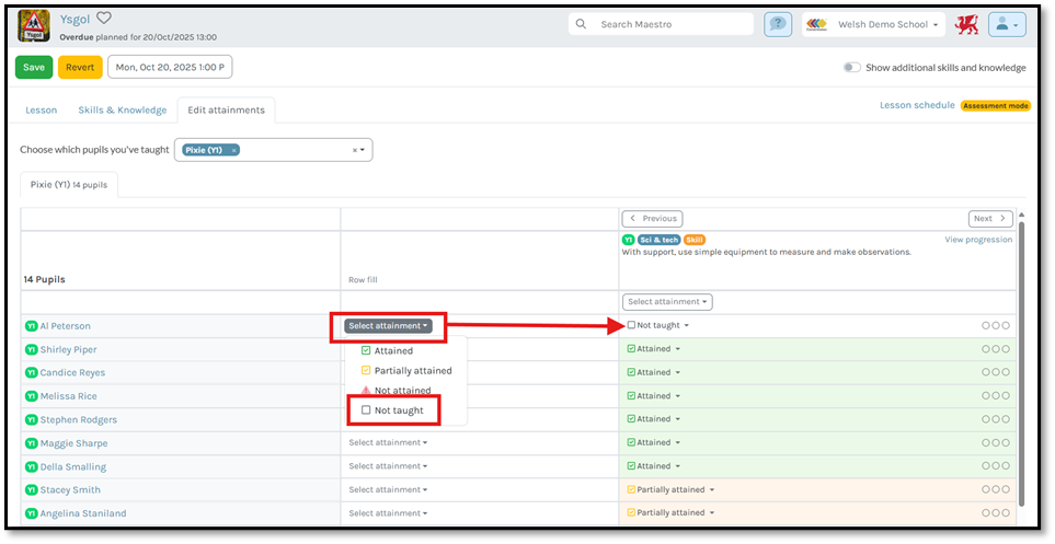 All children are marked as Attained for the objectives that were taught as part of the lesson.